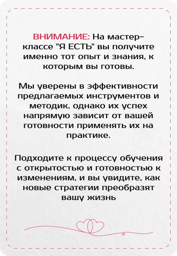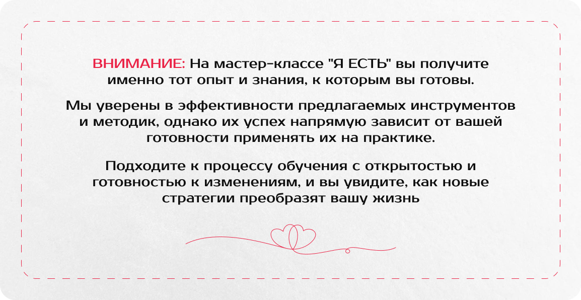 Мастер-класс охватывает темы самоприятия, установления личных границ и эффективного построения взаимоотношений в семье и социуме. Программа включает теоретические занятия, практические упражнения и обсуждения.